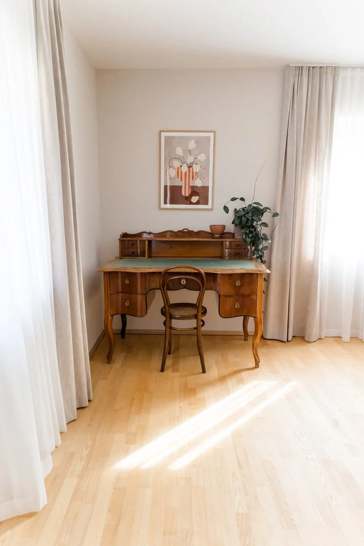 Die großzügige Praxis von Mag. Elisabeth Feizelmeier im idyllischen Bauernhof-Ambiente wurde nachhaltig modernisiert, wobei Bestehendes sensibel ins neue Konzept integriert und Lieblingsstücke - wie ein antiker Schreibtisch - neu in Szene gesetzt wurden.