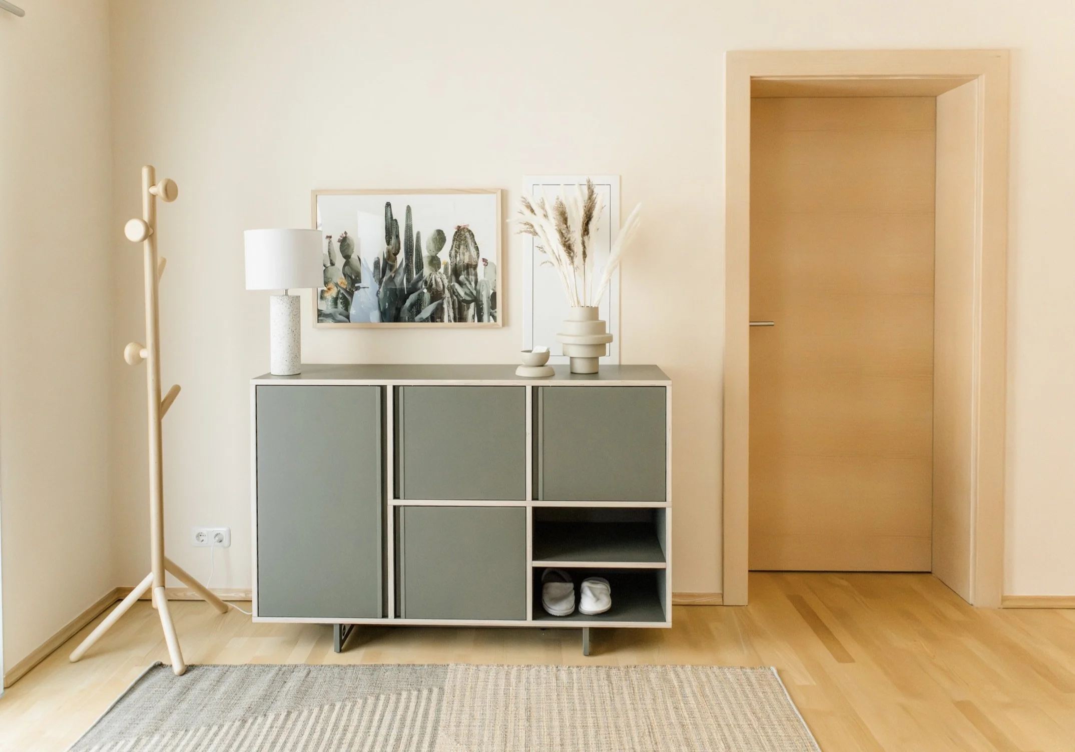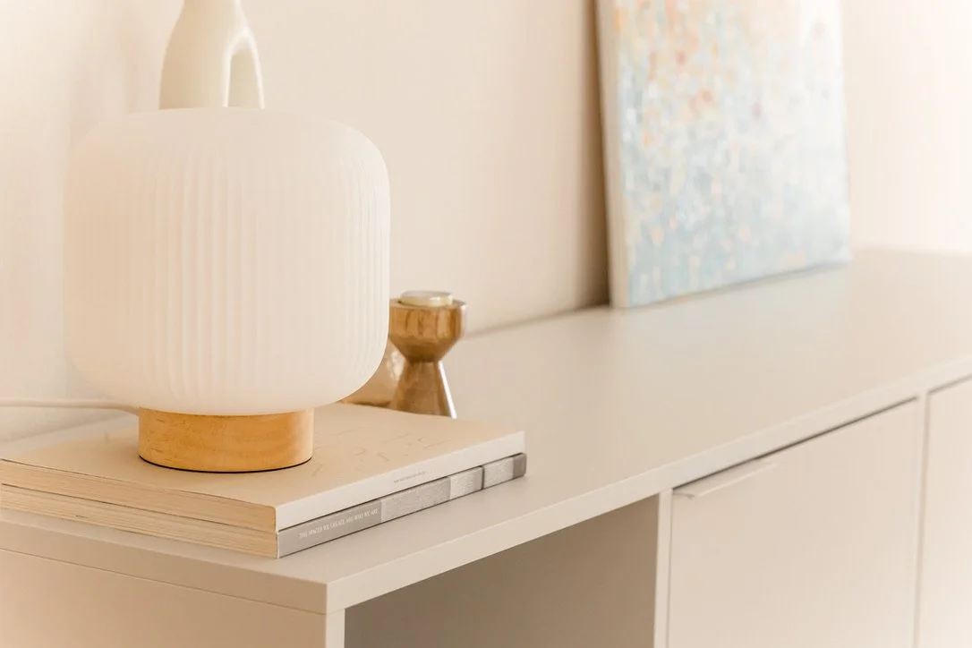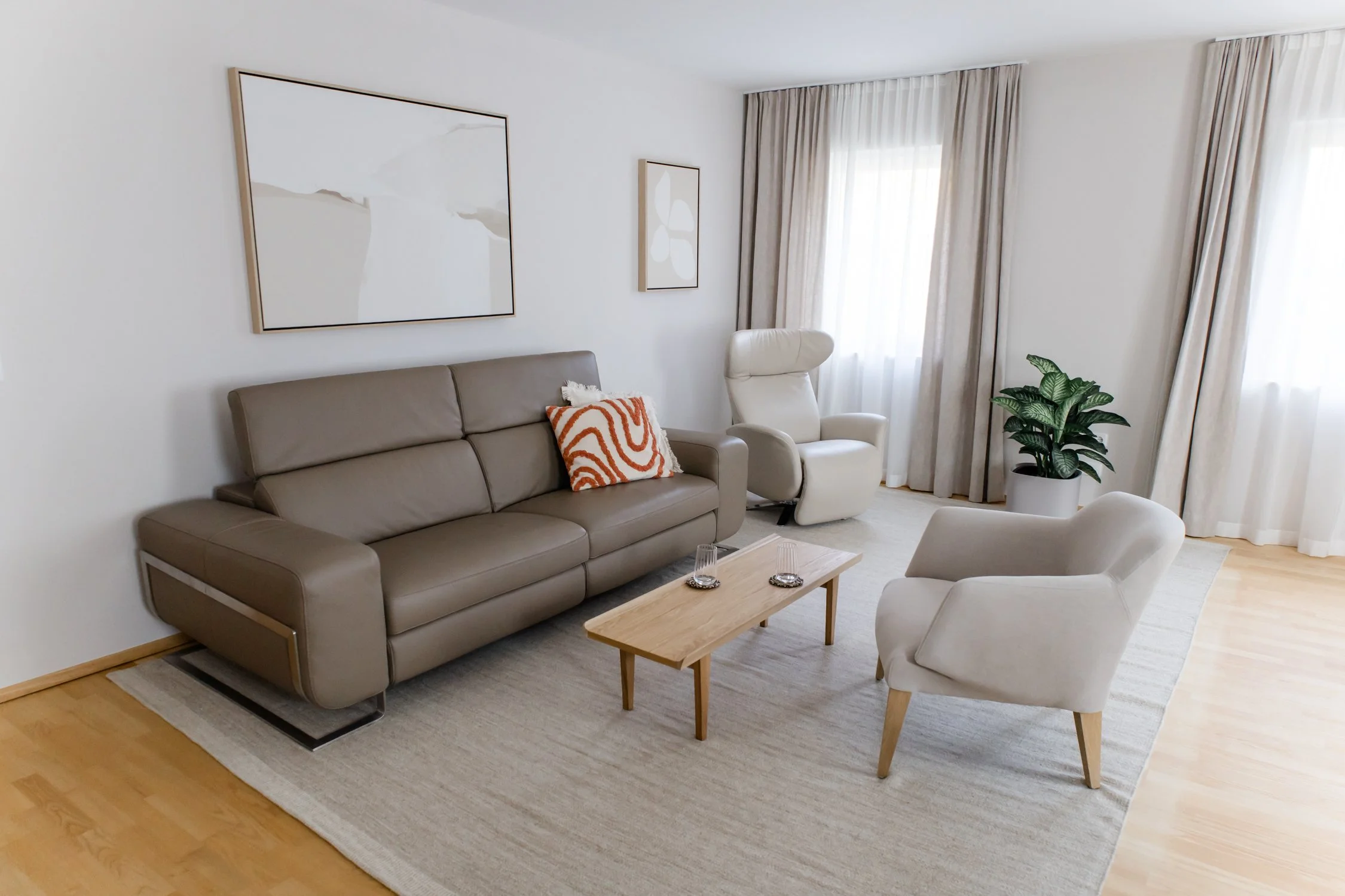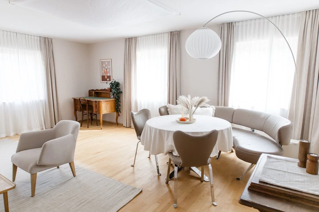 Das zurückhaltende Farbkonzept unterstützt Tiefenentspannung und erleichtert den Zugang zu Hypnose und innerer Balance. Hier wurde viel Bestehendes achtsam integriert und besondere Lieblingsstücke neu in Szene gesetzt.